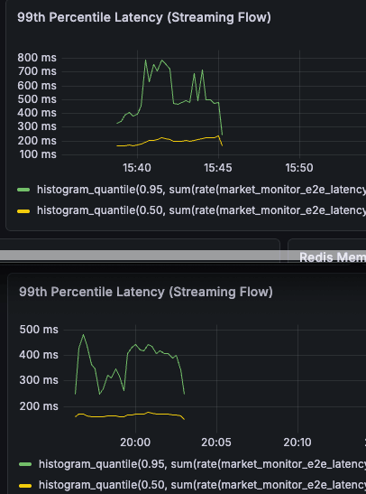 P99 latency is reduced from 700ms to 450ms roughly (Green line).